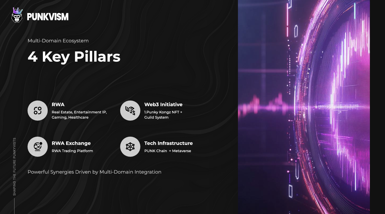 Through PUNK Chain development, this pillar builds a blockchain infrastructure optimized for RWAs and secures technical, legal, and financial infrastructure through strategic partnerships. The Punkvism open-world metaverse realizes the fusion of physical assets and digital experiences. Beyond a mere virtual world, this metaverse serves as an integrated interface for intuitive access and interaction with RWAs across domains. Its key differentiator is utilizing the metaverse not just as a game or social platform, but as a bridge between real and digital assets and an intuitive embodiment of the multi-domain accessibility hub. Users can explore real estate projects, engage with entertainment IP, participate in games, and access the RWA exchange within the virtual world, minimizing Web3 complexity and maximizing overall user experience.